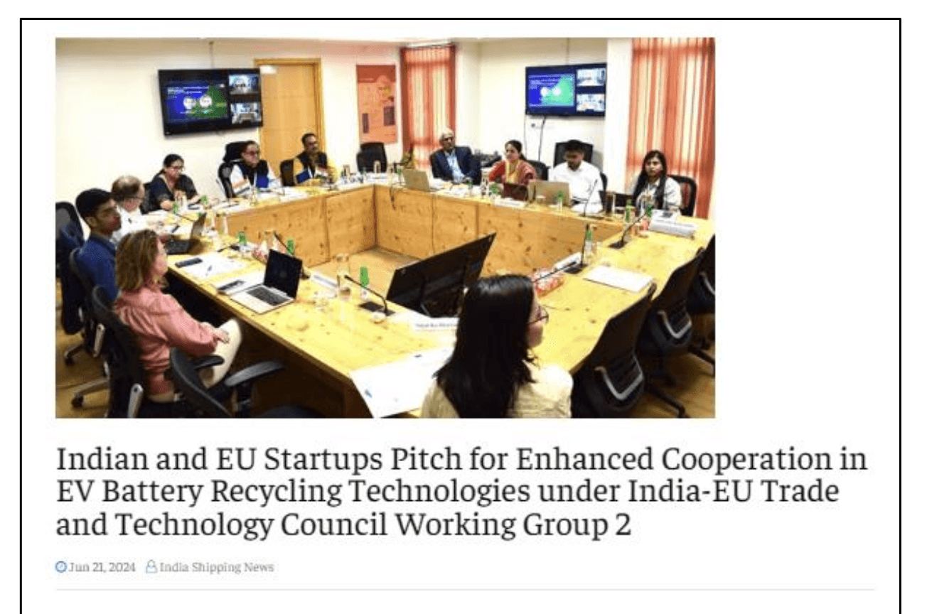 As part of this initiative, a matchmaking was organised to connect European and Indian startups working in Battery Recycling Technologies for Electric Vehicles (EVs), accelerating business development in this sector. The exchange of knowledge and expertise will be instrumental in advancing the circularity of rare materials and transitioning towards carbon neutrality in both India and the EU. This partnership is co-chaired by the Office of the Principal Scientific Adviser to the Government of India and from the EU side by the Directorate-General for Research and Innovation of the European Commission. Along with Ginger SOFRECO, NTCS GreenBee is playing a crucial role as an expert in this project, assisting in the selection and matching of EU innovators. The selected startups will visit electric vehicle battery recycling facilities and meet with stakeholders in EU and India, respectively, with the possibility to receive financial support for the immersion trip (travel and subsistence) as a reward. Additionally, GreenBee provided valuable context on the current state of EV battery recycling in the EU. This initiative is ongoing, promising to foster significant advancements in clean energy through international cooperation.